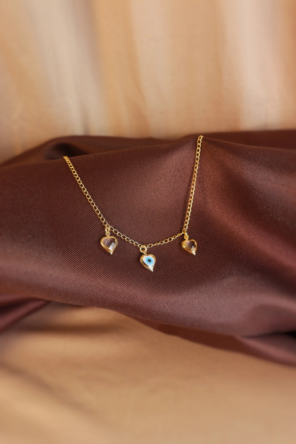 A tornozeleira exibe um delicado equilíbrio entre a graciosidade dos corações adornados com pontos de luz cintilantes e a proteção mística do olho grego, tudo pendurado em uma corrente dourada que irradia brilho sutil, oferecendo um toque de requinte que captura a luz e a atenção.